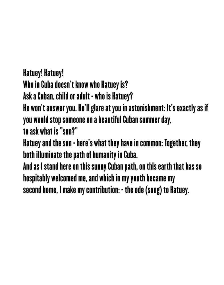 The poem Hatuey was written in Yiddish in Cuba by Asher Penn, who immigrated to Cuba from the Ukraine as a sixteen year old to escape pogroms. As a child, he witnessed his friends and family killed by Cossacks. While he never mentions his experience in the poem, one feels its presence in the forceful invective against violence of the Spanish and celebration of Hatuey as freedom fighter. The 125 page poem was translated into Spanish, soon after it was written, taught in Cuban high schools and colleges. Now, to facilitate our working on the opera, there is an English translation by Moisha Rosenfeld.